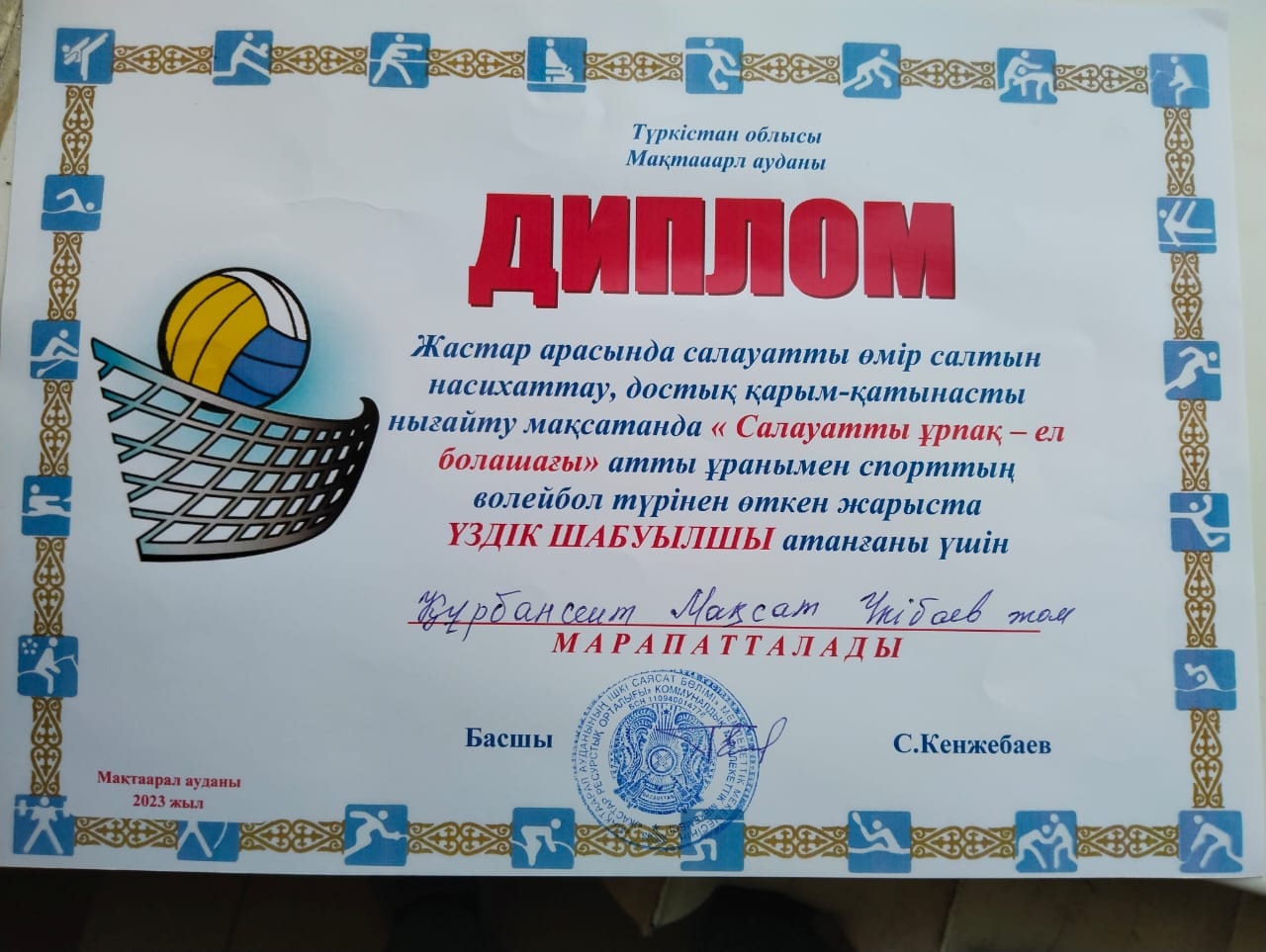 Мақтарал ауданы адами әлеуетті дамыту бөліміне қарасты Қ Үкібаев атындағы №37 жалпы орта мектебі коммуналдық мемлекеттік мекемесінің оқушылардан құралған "волейбол" командасы "Салауатты ұрпақ— ел болашағы" атты ұранмен Жамбыл Ауылдық Округі Жастары арасында өткізілген жарыста